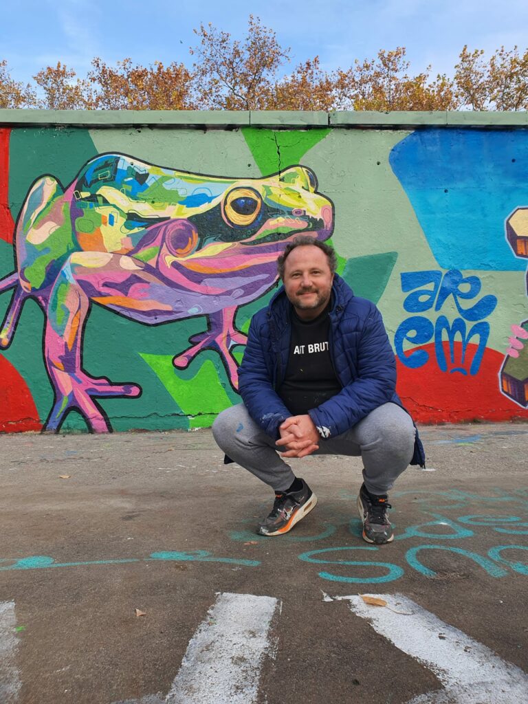 Né dans la déflagration brute du graffiti, AREM a fait ses premières armes dans les années 90, là où la ville ne dort jamais vraiment : friches, trains, tunnels, marges vibrantes. De ces années clandestines, il garde une calligraphie instinctive, un amour des lettres qui se tordent, s’étirent, respirent, et une obsession presque chorégraphique des lignes percutant les couleurs pops. Chez lui, la couleur ne remplit pas, elle pulse. La ligne ne délimite pas, elle raconte. C’est ce qu’il nomme le « calligraffiti ».